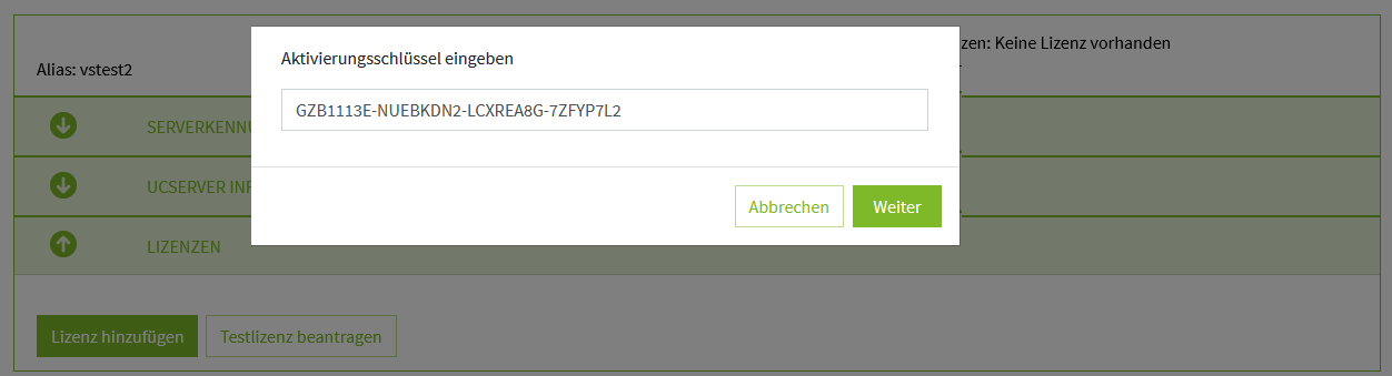 Beispiel Screenshot: UCConnect - Lizenz hinzufügen und Aktivierungsschlüssel eingeben