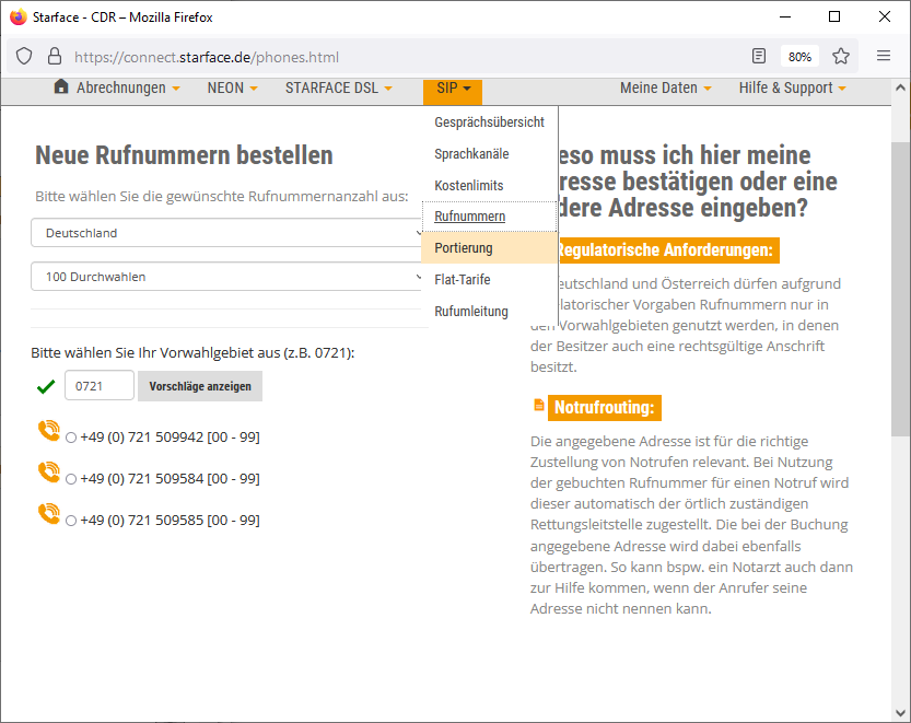 Wählen Sie im Menü "SIP" und entscheiden Sie sich für die Portierung eines vorhandenen Rufnummernbereichs oder der Bestellung neuer Rufnummern