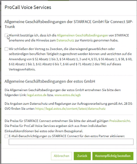 Die Abrechnung über die monatlichen Kosten wird über den estos Partner erstellt. Um die Telefonanlage zu starten, müssen Sie den AGB (Allgemeinen Geschäftsbedingungen) der estos GmbH und der STARFACE GMBH sowie den Angaben zum Datenschutz und den Regelungen zur Auftragsverarbeitung zustimmen.