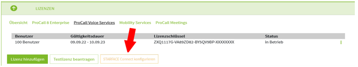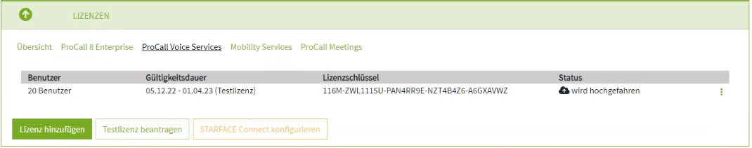 Der Status der Telefonanlage wird unter "Lizenzen - ProCall Voice Services" angezeigt.