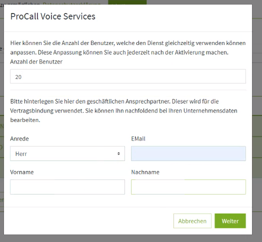 Im nächsten Schritt legen Sie fest, wie viele Benutzer die ProCall Voice Services nutzen sollen. Sie müssen eine Kontaktperson angeben, die die Informationen zum SIP-Trunk, Lizenzen usw. erhalten soll.