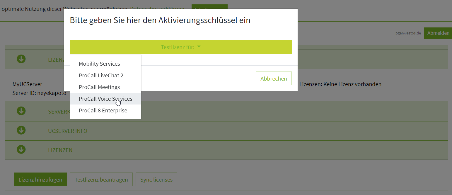 Um eine Testlizenz zu beantragen, haben Sie ganz einfach in UCConnect in dem Drop-Down-Menu 'Testlizenz beantragen' die Möglichkeit, ProCall Voice Services auszuwählen.