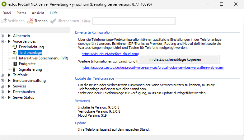Beispiel Screenshot: UCServer Verwaltung - Voice Services - Telefonanlage - Erweiterte Konfiguration