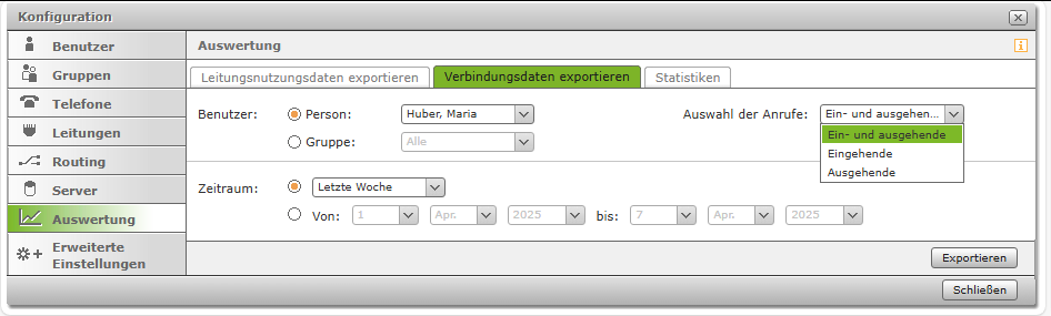 In diesem Reiter kann über mehrere Drop-Down-Felder festgelegt werden, welche Verbindungsdaten für einen Benutzer oder eine Gruppe exportiert werden. Es können auch Zeiträume für die zu exportierenden Daten gesetzt werden.