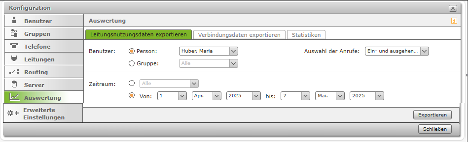 Beispiel Screenshot - Konfiguration - Auswertung - Leitungsnutzungsdaten exportieren