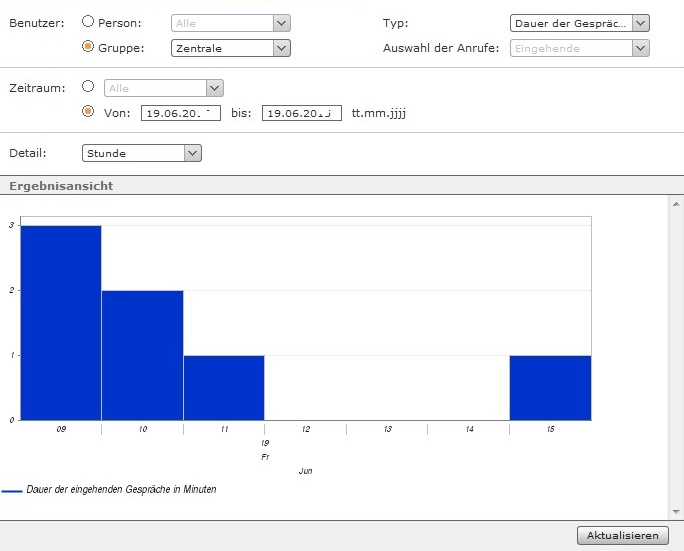 In diesem Reiter ist es möglich, grafische Darstellungen der Verbindungsdaten ausgeben zu lassen. Auch hier besteht, über mehrere Checkboxen und Drop-Down-Menüs, die Möglichkeit zu beeinflussen welche Daten dargestellt werden.