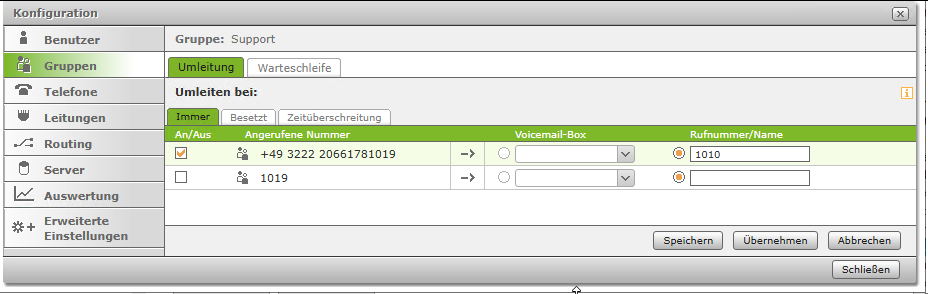 Beispiel Screenshot: Konfiguration - Gruppen - Umleitung - Immer, Besetzt, Zeitüberschreitung