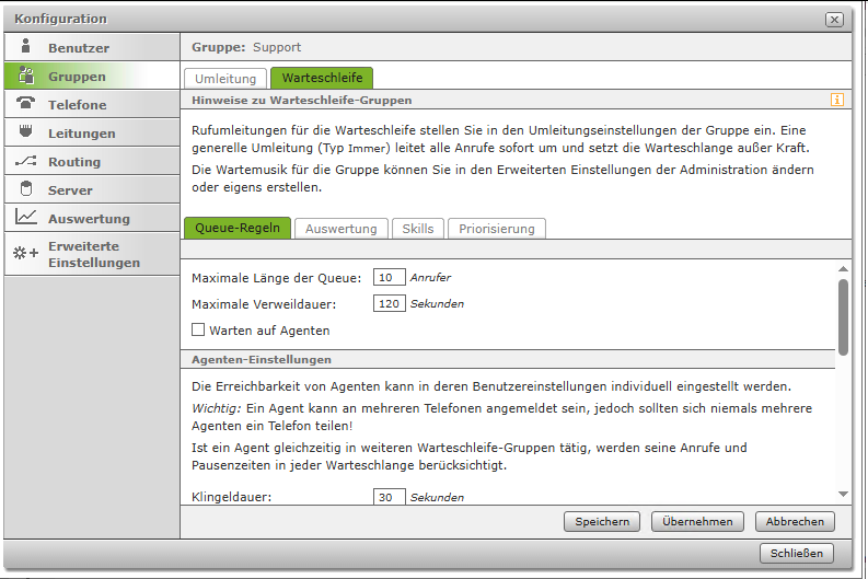 Beispiel Screenshot: Konfiguration - Gruppen - Warteschlange - Queue-Regeln