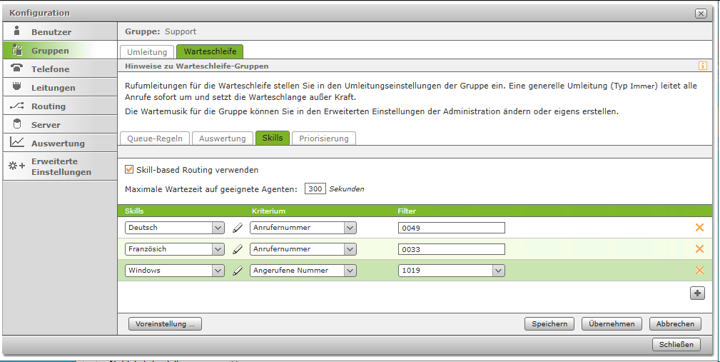 Skill-based Routing dient dazu, eingehende Rufe dem passenden Mitglied in der Warteschleife basierend auf individuellen Skills der Agenten zuzuweisen. Dazu sollten vorab den entsprechenden Benutzern der Warteschleife-Gruppe die Skills zugewiesen werden (siehe auch „Benutzer - Skills"). Die Option "Skill-basiertes Routing" benötigt eine zusätzliche, kostenpflichtige Lizenz.