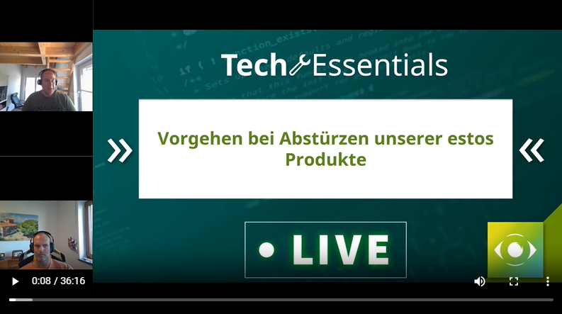 In den Tech Essentials LIVE am 20. Juni 2023 unter dem Thema "Aktuelles aus dem Produkt-Support" ging es um Vorgehen bei Abstürzen unserer estos Produkte.
