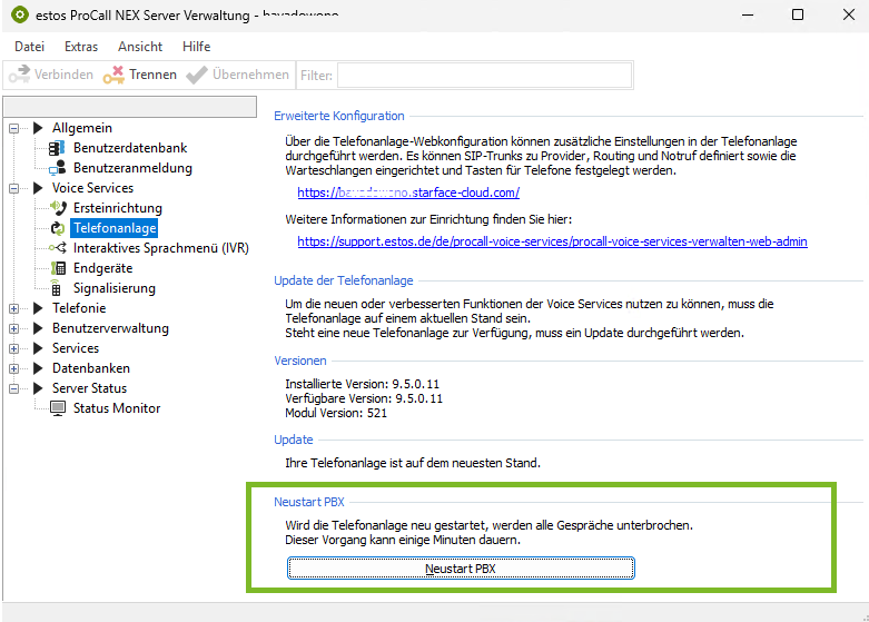 Beispiel Screenshot ProCall NEX Server Verwaltung - Voice Services - Telefonanlage - Neustart PBX ausführen...