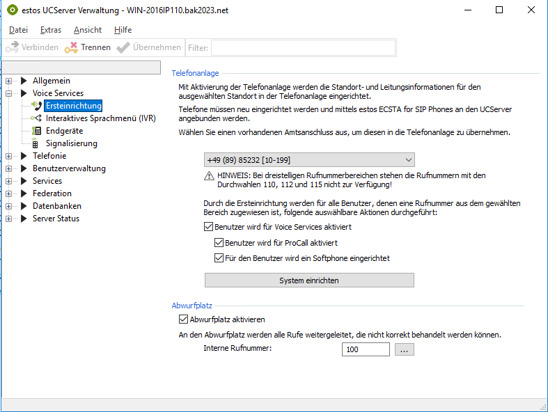 Beispiel Screenshot: estos UCServer Verwaltung - Voice Services - Ersteinrichtung Telefonanlage und Einrichtung eines Trunk-Abwurfplatzes