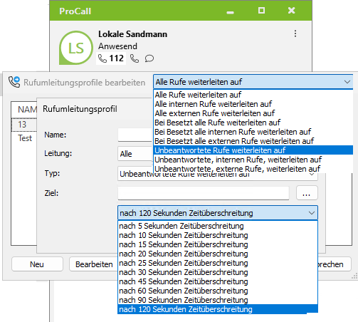 Beispiel Screenshot: ProCall Client - Rufumleitungsprofil - Weiterleitungsregeln einstellen
