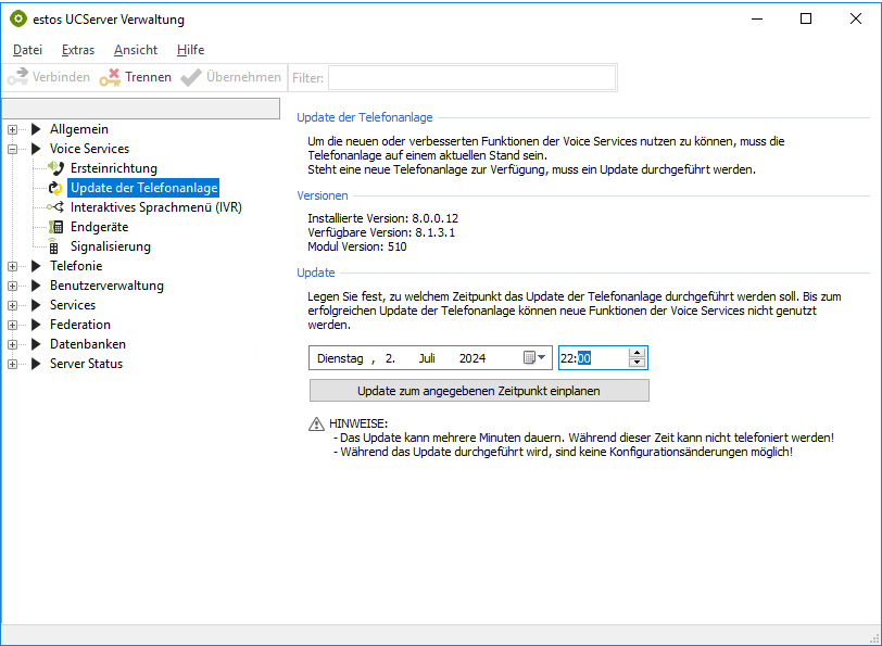Beispiel Screenshot: estos UCServer Verwaltung - Voice Services - Update der Telefonanlage