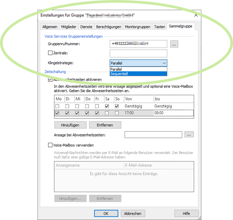 Beispiel Screenshot: Einstellung der Klingelstrategie für die Voice Services in der estos UCServer Verwaltung unter Sammelgruppe - parallel oder sequentiell definieren