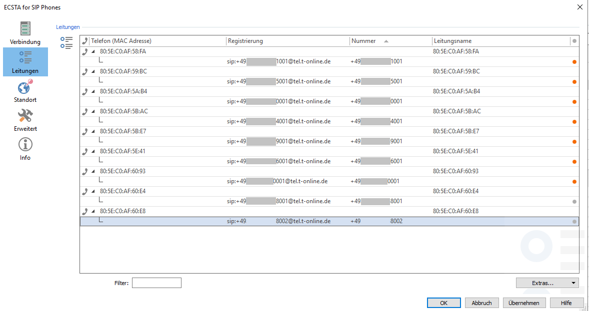 Phones connected with ECSTA for SIP phones no longer work in connection with Telekom CompanyFlex Cloud PBX as of December 2022. The view of the lines in ECSTA for SIP Phones remains in the "yellow" status and looks as follows as an example: