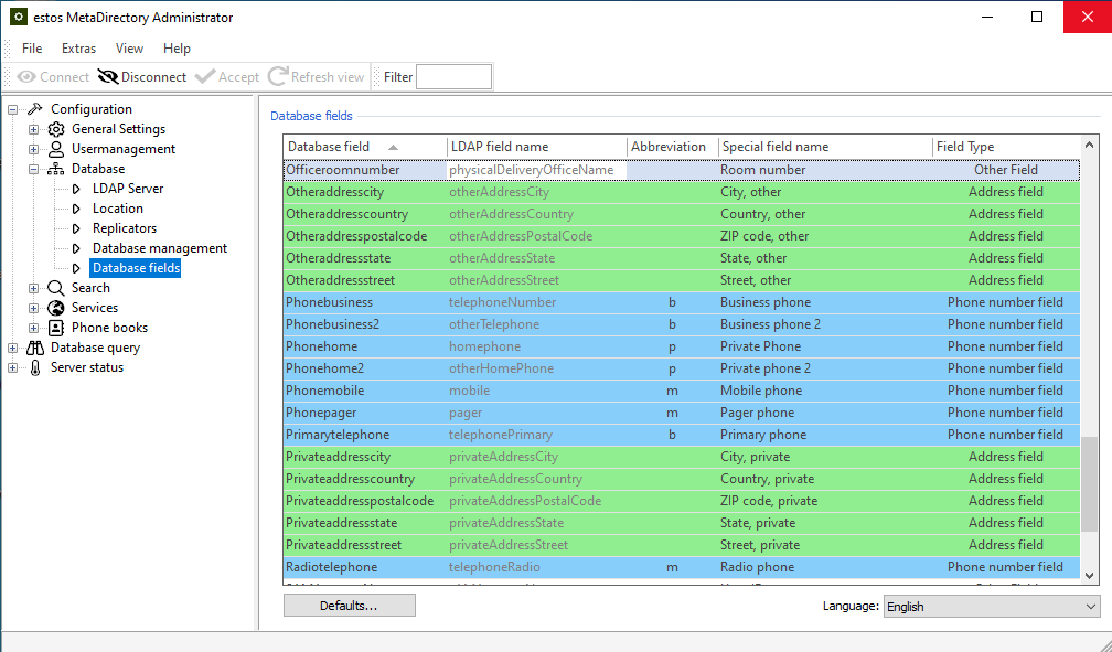 Example screenshot: MetaDirectory Administrator – Database – Database fields