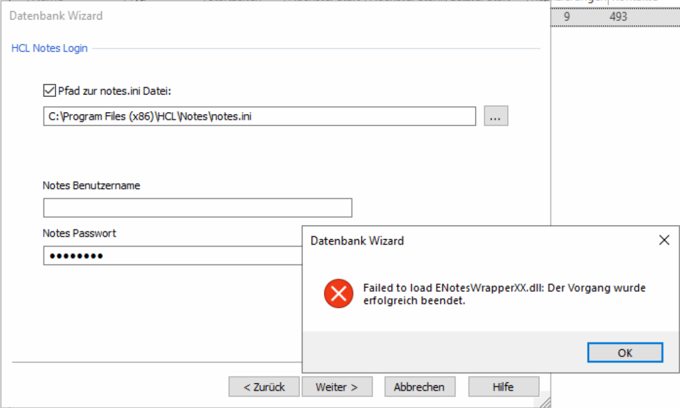 Example screenshot: MetaDirectory Database Wizard - HCL Notes - Error message Failed to load ENotesWrapperXX.dll