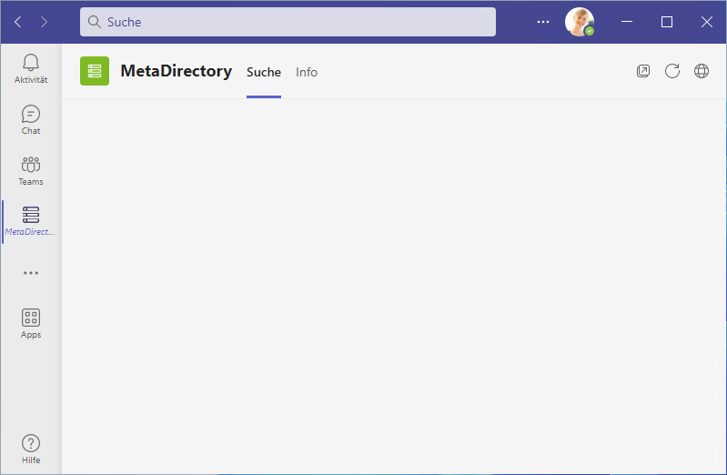 On some systems in a Microsoft Teams environment, the same user does not see the MetaDirectory app search page, which he can use on other systems without any problems. However, the app itself is active on the client. The necessary certificates are properly stored, which can be verified by calling the MetaDirectory search page in the browser from Teams: