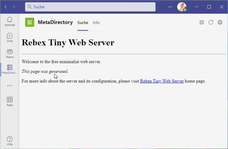 - Test first with a browser, if necessary locally on the server and on the client PC, where Microsoft Teams is used with the MetaDirectory App. The following page should then appear there: