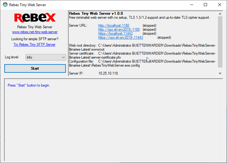 - Use the Start button to start the RebexTinyWebServer: