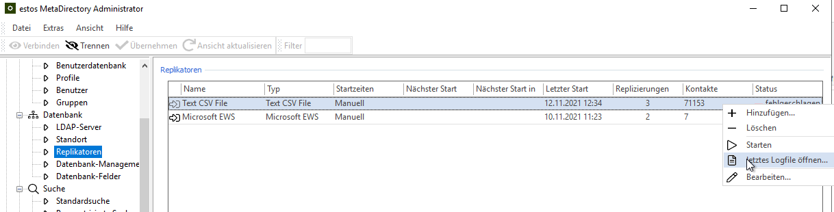 Example screenshot: MetaDirectory Administrator – Database – Replicators – Open last log file