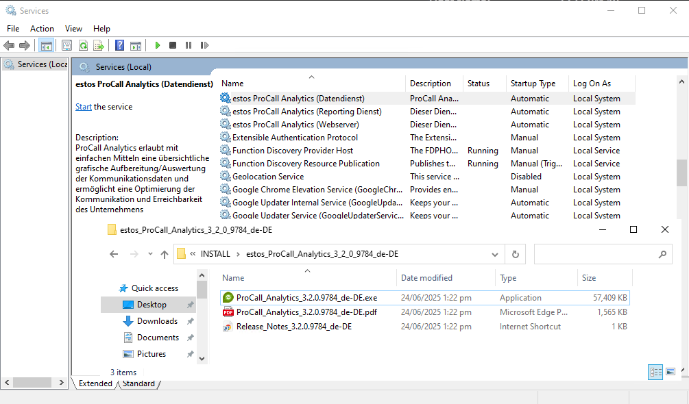 Example screenshot Local services - Services (Local) - estos ProCall Analytics data service, reporting service, web server - Stop services manually