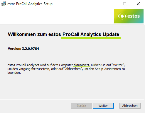 Example screenshot of ProCall Analytics Setup - Version detection - Welcome to estos ProCall Analytics Update - ... is updated on the computer.