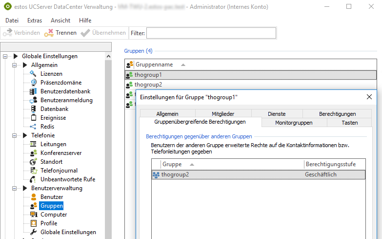 Example screenshot: UCServer DataCenter Administration - Global settings - User administration - Groups - Cross-group permissions - Permission level