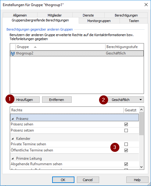 A group that is to receive rights to the group can be added via the "Add" button (1).