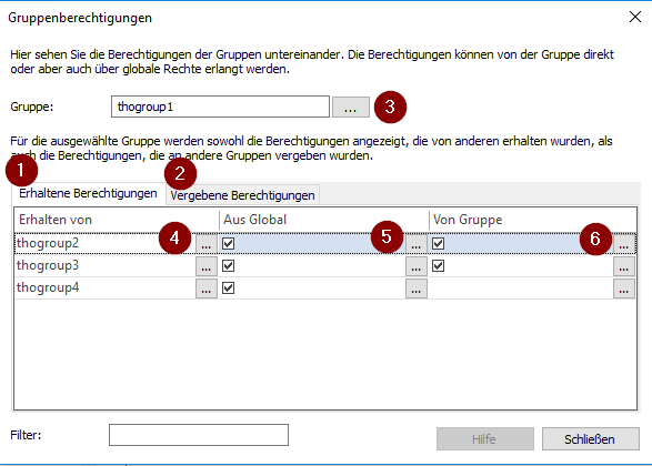 The other two columns show the origin of the rights, i.e. whether they are "Global" (5) or rights received/assigned at "Group" level (6). The "..." menu allows you to view the rights in detail and to edit the rights directly.