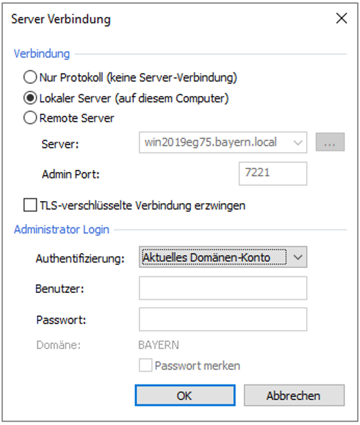 Example screenshot ProCall DataCenter – Server connection – Local server – Authentication – Administrator login – Current domain account