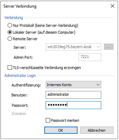 Example screenshot ProCall DataCenter – Server connection – Local server – Authentication – Administrator login – Domain account