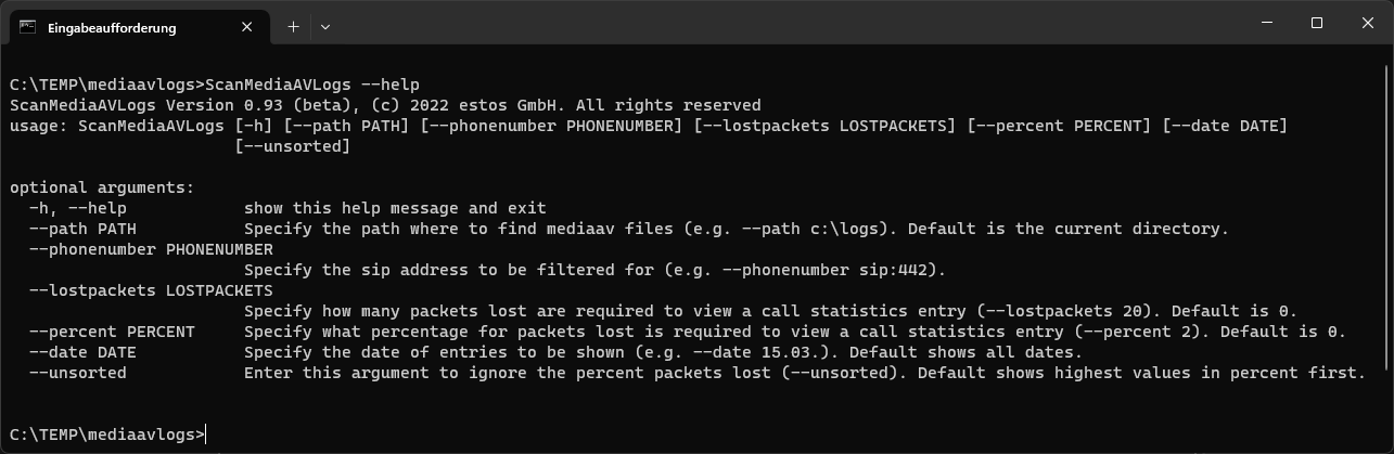 | --path | <PATH> as a string | C:\TEMP\mediaavlogs>ScanMediaAVLogs.exe --path c:\temp\mediaavlogs C:\TEMP\mediaavlogs>ScanMediaAVLogs.exe --path "\\desktop-abc\c$\Program Files\estos\UCServer\logs" C:\TEMP\mediaavlogs>ScanMediaAVLogs --path . > .\result.txt | Output of all available statistical data records and descending sorting by package loss rate. | This option specifies the storage location of the log files to be analyzed mediaav_YYYY_MM_DD_HH_MM.txt. It is possible to specify an absolute, relative or UNC path. The output redirection to a file can also be used as usual. |