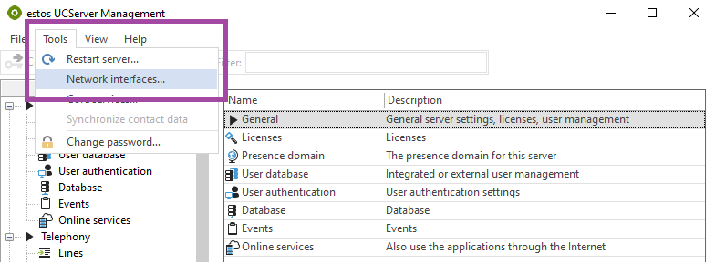 The network interfaces recognised by ProCall Enterprise Server are displayed in the UCServer Administration. To view them, select the item Extras in the toolbar and then the sub-item Network Interfaces...: