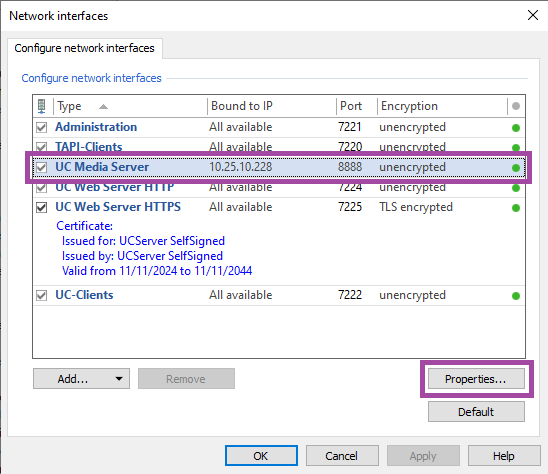 Here, select the row UC Media Server and click the button Properties... or simply double-click on the row UC Media Server.