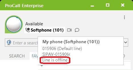 Example screenshot: ProCall Enterprise client: Softphone – line is offline