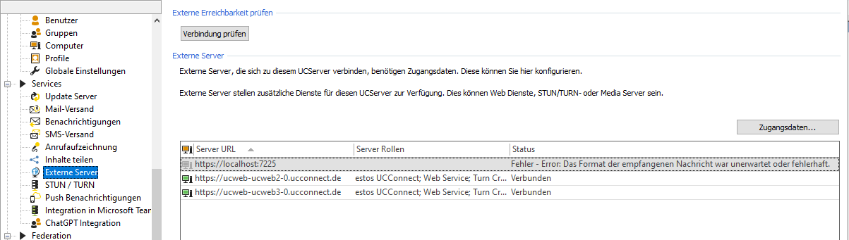 In the estos UCServer administration under Services – External servers, https://localhost:7225 shows the status "The format of the received message was unexpected or incorrect."