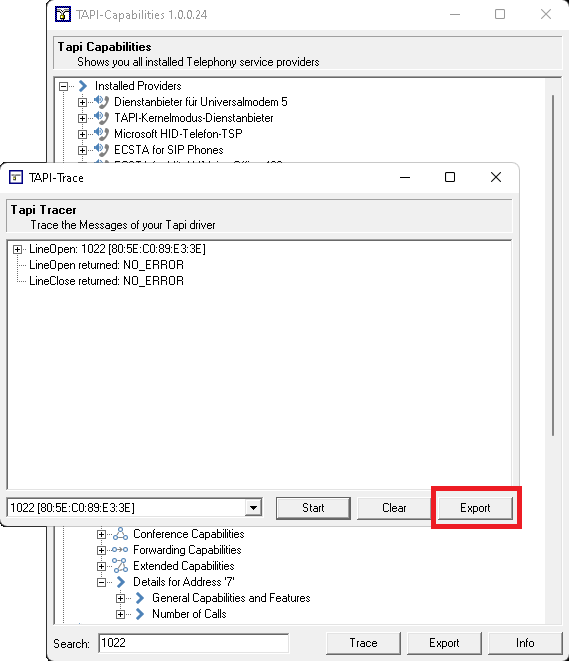 Using the tool TAPI-Capabilities consisting of the application file TapiCaps.exe you can create trace files for individual or multiple TAPI lines to make them available for analysis.