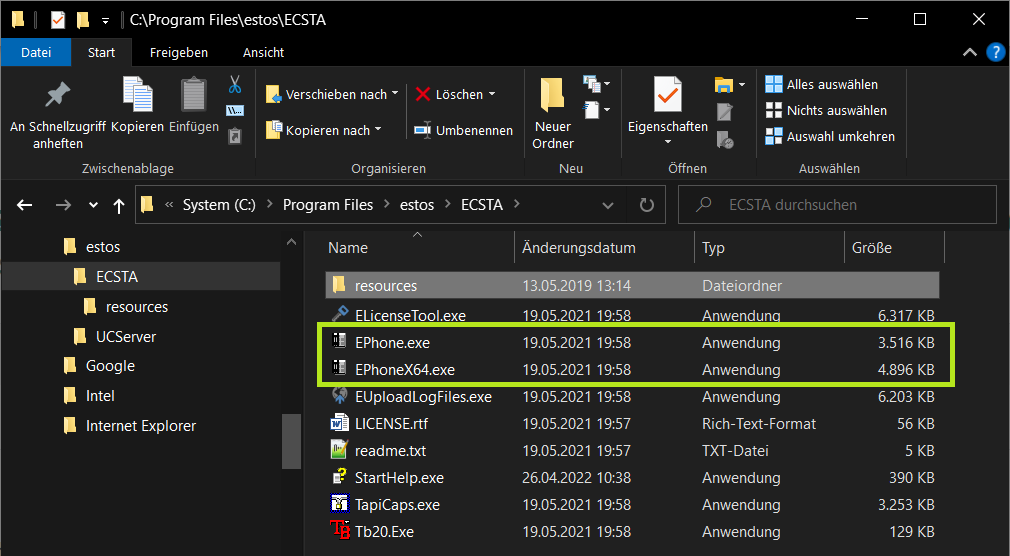 Example screenshot: EPhone.exe and EPhonaX64.exe at estos ECSTA in the Program Files