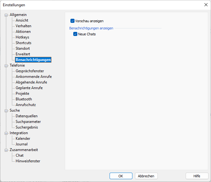 Under Notifications you can set the ProCall Client for Windows to display new chats and, if necessary, a preview of them: