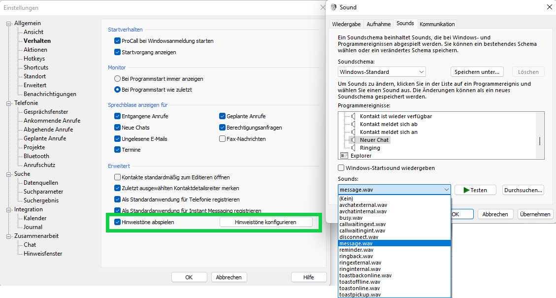 If you want to set a specific sound for new chat messages, for example, go to the settings on the ProCall client. Under General – Behavior – Advanced, you can configure notification sounds. Under Sounds, select the item "New chat" for program events and set up the desired notification tone under Sounds.