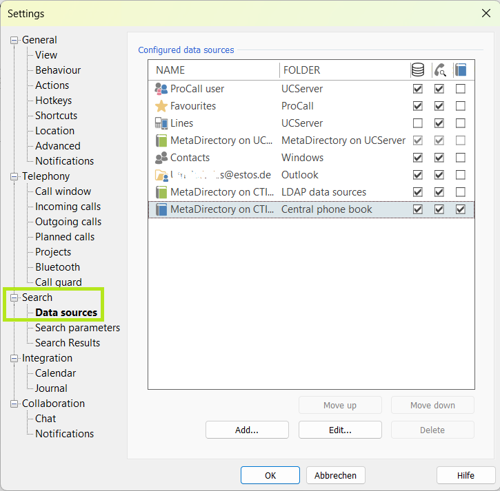 ProCall Enterprise enables the setting and configuration of (external) data sources. The data sources settings contain the list of all contact data sources that are used for contact resolution and as search results in search queries from ProCall Enterprise. With the help of these data sources, ProCall Enterprise can not only search and find contacts in the favorites, but also all contacts from other sources that are connected to ProCall, for example, groupware, ERP and CRM systems or telephone directories.