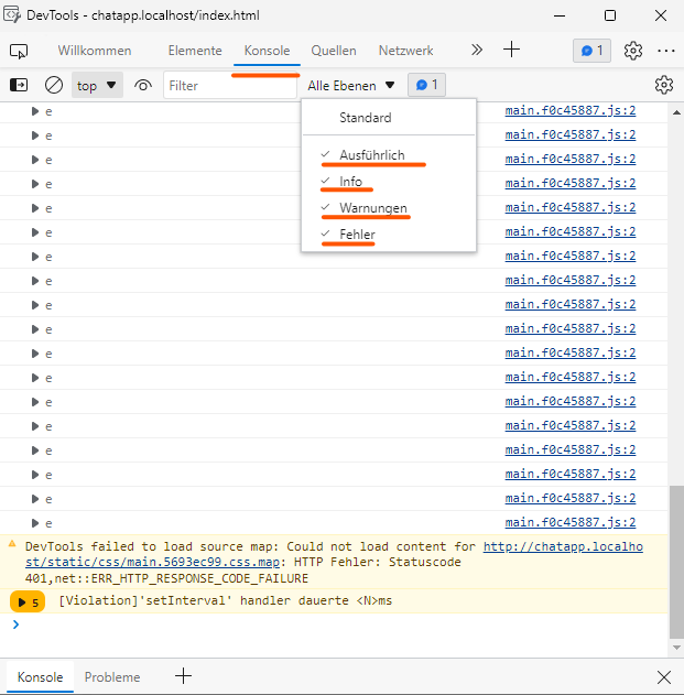 For certain observations, such as "There is no connection to the server...", outputs from the web development tools (DevTools) integrated in the browser used are therefore also necessary, which must also be made available for an error analysis: