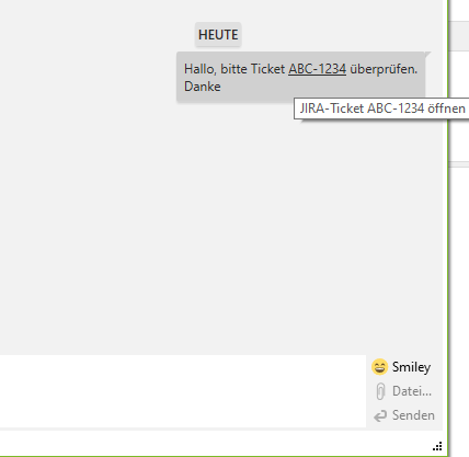 If an expression of the form "ABC-1234" is used in the chat window, the tooltip "Jira ticket ABC-1234" is displayed for it and a link to "https://jira.server.de/browse/ABC-1234" is generated.