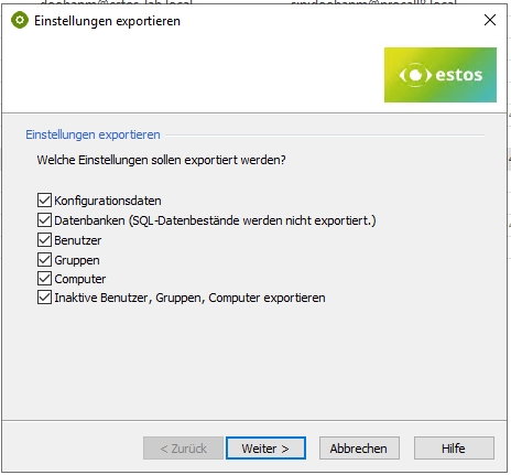 If a local user administration is used, it is mandatory to select and export the settings for users, groups and computers. Otherwise these settings will be lost!