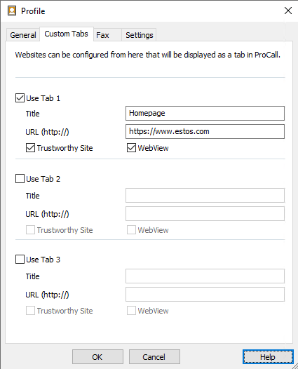 Additional tabs can be set up in the ProCall Client via profile settings, which can display web pages.