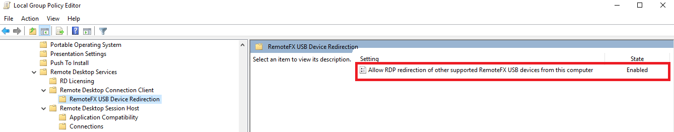 Computer Configuration\Administrative Templates\Windows Components\Remote Desktop Services\Remote Desktop Session Host\RemoteFX USB Device Redirection