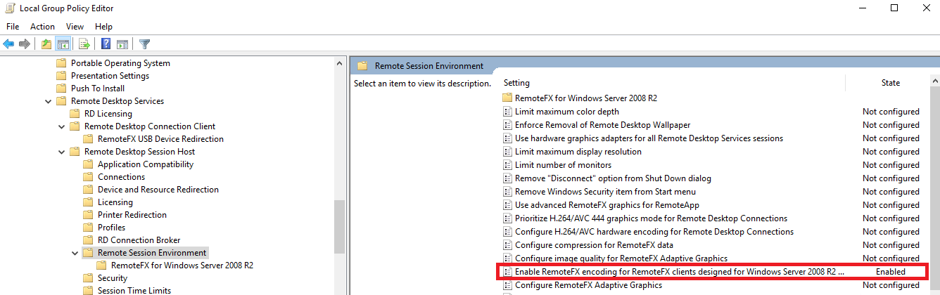 Computer Configuration\Administrative Templates\Windows Components\Remote Desktop Services\Remote Desktop Connection Host\Remote Session Environment\RemoteFX for Windows Server 2008R2