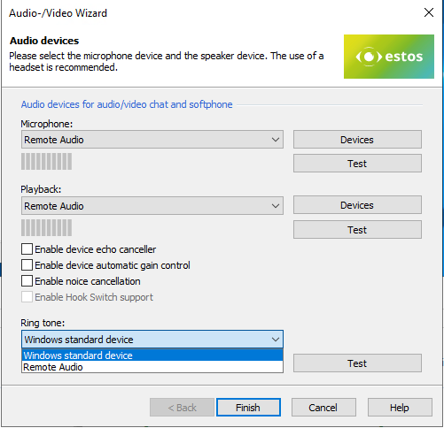 The remote audio is the headset in the setup. To be able to hear a ringtone on the PC, it is important to select the Windows standard audio device here.